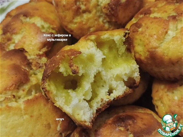 Мне нужна была штучная выпечка на вынос, поэтому пекла в духовке в маленьких формочках и без крема. За основу брала стакан 200 мл. Зефир на цвет был зеленоватый, поэтому и в разрезе цвет такой интересный получился. Выпекала 25 минут при 190 градусах. Получились вкусные, воздушные кексики. Им надо дать хорошо остыть, чтобы потом легко вынуть из формочек.