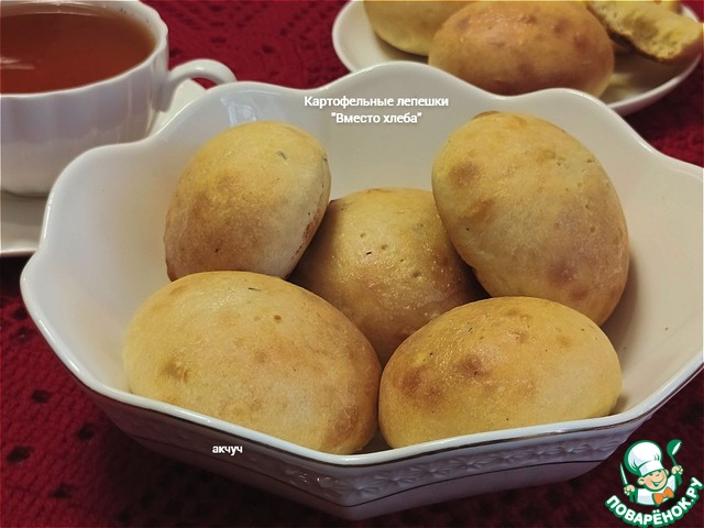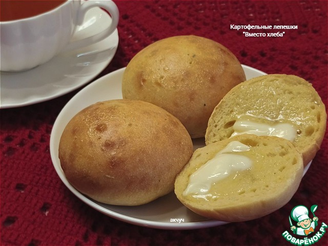 В холодильнике залежалось картофельное пюре. Как раз для рецепта подошло. Готовила половину нормы. Замес доверила ХП. Как я не старалась, у меня вышли не лепешки, а булочки. Ну и ничего, главное, что получилось ооочень вкусно. Выпекала 18 минут при 180 градусах. Не удержалась, еще горячие намазала маслом и с кофейком!