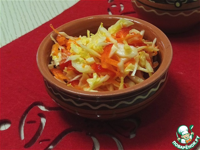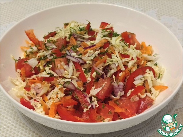 Я переделала салат под свой вкус. Капуста была пекинская, лук красный. Обошлась без перца и майонеза, добавив масло оливковое и лимонный сок, от себя еще нарезала укроп. Получилось вкусно и не так калорийно.