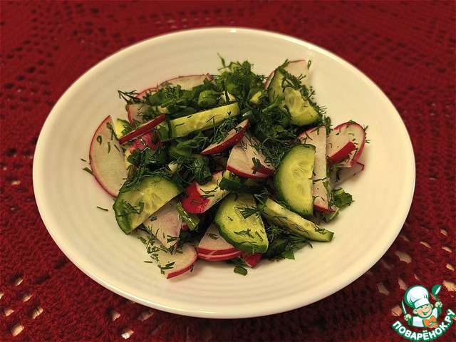 Вместо листьев салата использовала пекинскую капусту, обошлась без лука и редиски. Заправляла оливковым маслом и лимонным соком. Получился очень вкусный витаминный салатик!