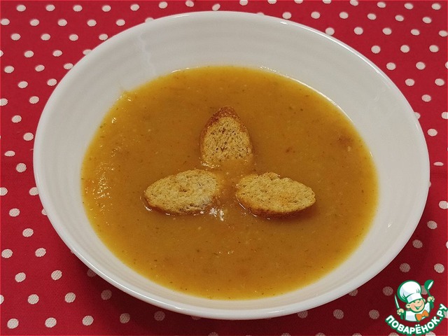 Я немного изменила рецепт. Все овощи сразу положила в воду и варила их вместе, добавив соль, перец чили и копченую паприку. От себя добавила укроп. Потом все измельчила погружным блендером. Получился вкусный, слегка сладковатый суп. Мне понравился.