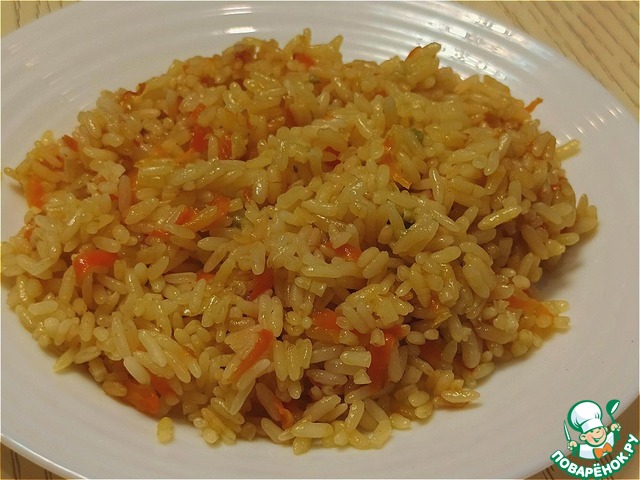 Я внесла некоторые изменения. Предварительно слегка обжарила лук, морковь и чеснок, а уже потом добавила рис. Вместо воды использовала бульон, который во время приготовления несколько раз добавляла. Получился вкусный гарнир на ужин!