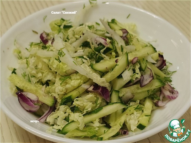 В последнее время часто готовлю салаты с капустой, заменив белокочанную на пекинскую. Укроп использовала свежий. Получился вкусный сочный салатик. От себя добавила чуть лимонного сока.