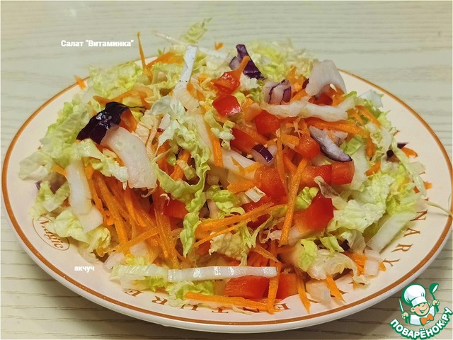 Готовила салат для себя, поэтому внесла некоторые изменения. Вместо белокочанной капусты была пекинская и заправляла салат маслом и чуть лимонным соком. Получилось очень сочно и вкусно.