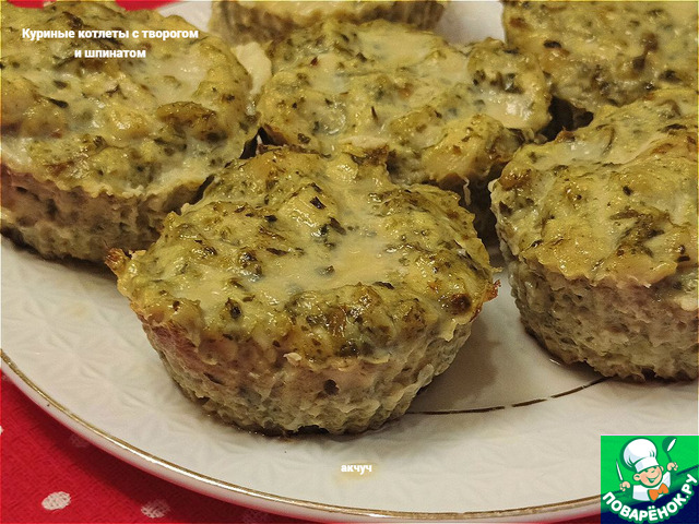 Вместо шпината использовала петрушку из морозилки. От себя добавила хмели-сунели. Обошлась без панировки. Фарш вышел жидковатым, но меня это не смутило, так как выкладывала в формочки. Выпекала в силиконовых формочках 30 минут при температуре 180 градусах. Получились вкусные, сочные котлетки!