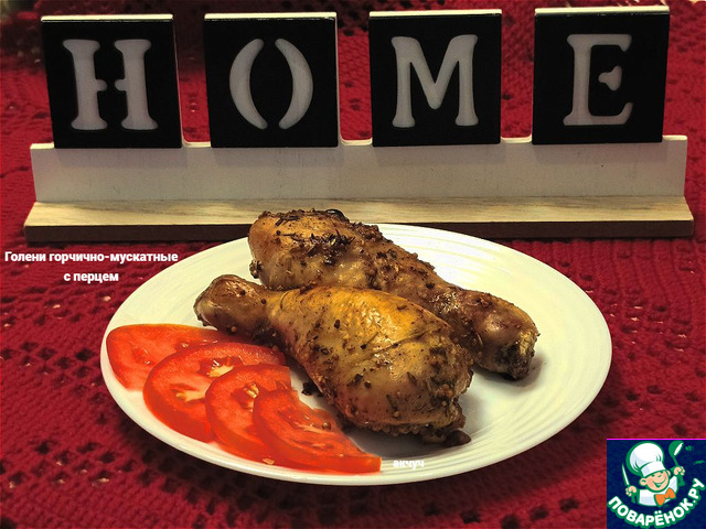Голень мариновала намного дольше, вместо семян горчицы использовала французскую горчицу, без болгарского перца, остальное по рецепту. Получилась вкусная загорелая курочка!