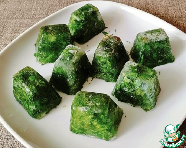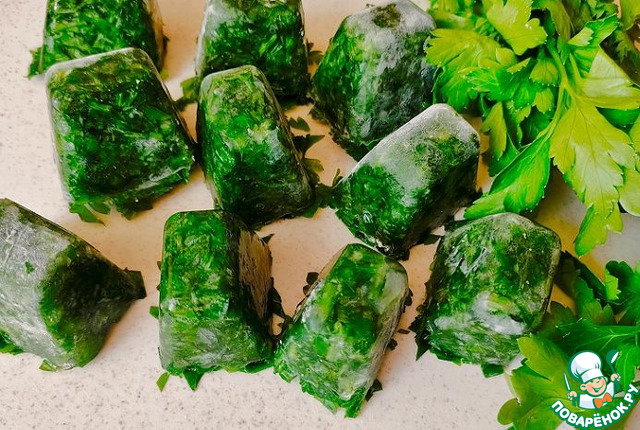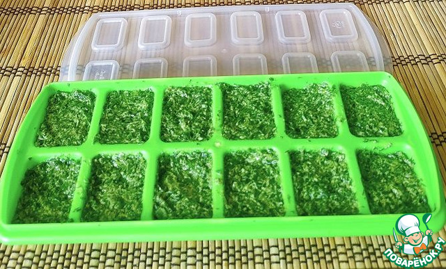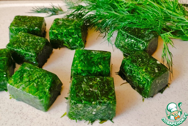У меня петрушка и укроп, отдельно. Нарезала мелко, как смогла, измельчать блендером не стала. И… залила водой. Зимой пригодится!