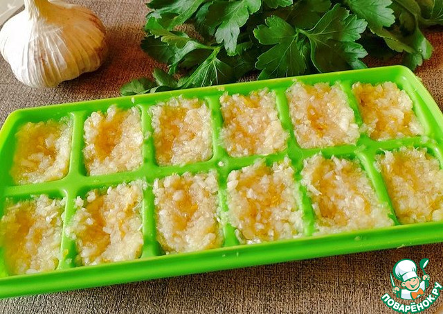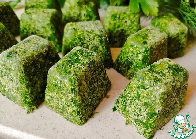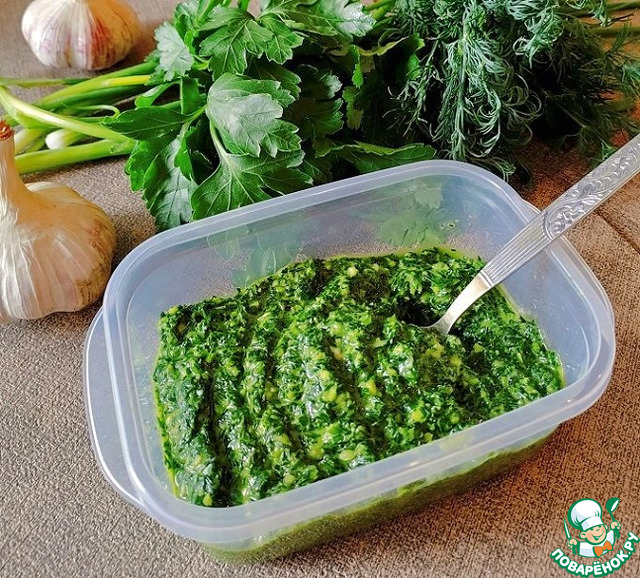 Необыкновенно вкусно, ароматно!!! Масла добавила меньше. Измельчила в кухонном комбайне. У меня лук зеленый, укроп и петрушка. Поставила в морозилку.