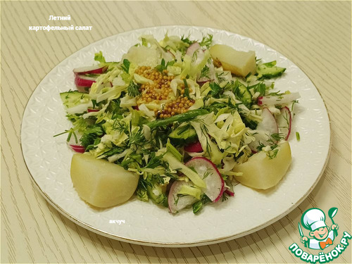 Быстренько приготовила на ужин салатик. Вместо листьев салата использовала молодую капусту и добавила от себя петрушки. Картошечка молодая! Очень вкусно поужинала!