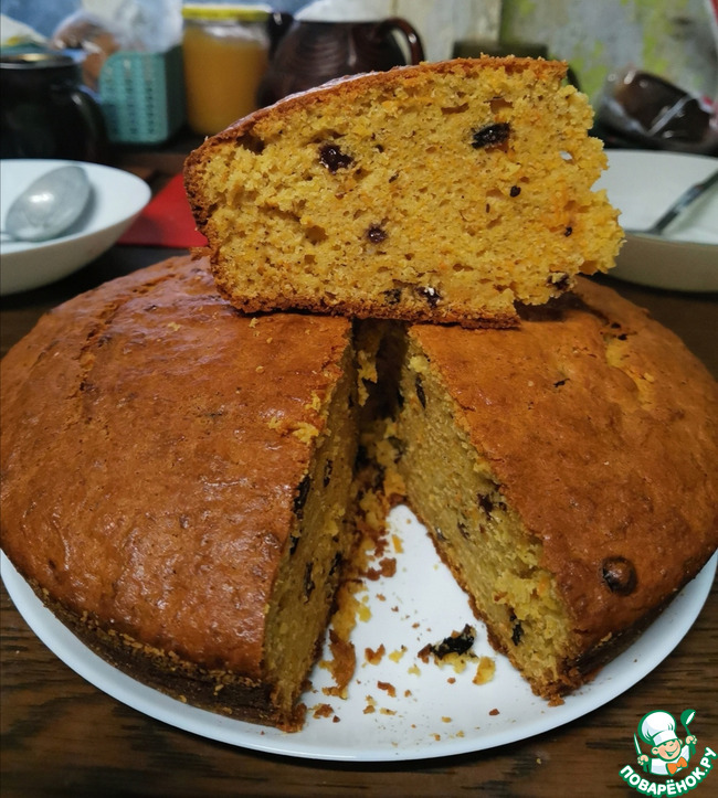 В общем, разрез шикарный, всё пропеклось, кекс высокий, цвет оранжевый, изюм равномерно расположен. На двойную порцию достаточно формы диаметром 26 см, высота бортиков 7 см.