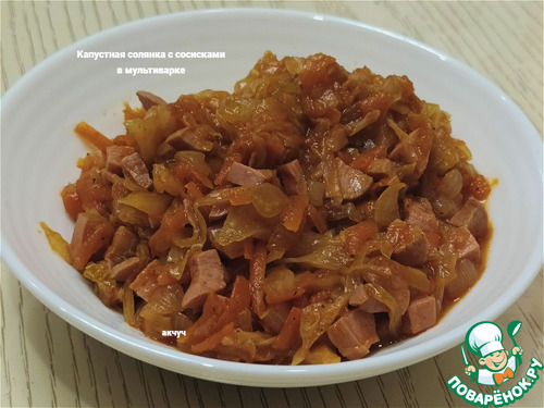 Такую солянку я готовлю обычно на плите, но сегодня решила воспользоваться рецептом и использовала мультиварку. Я почти сразу к капусте добавила лук и морковку и потом уже все вместе немного пожарила, а потом тушила. Вместо кетчупа был томатный соус. Очень вкусно получилось!
