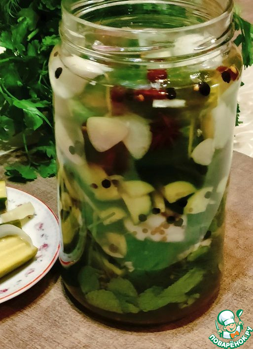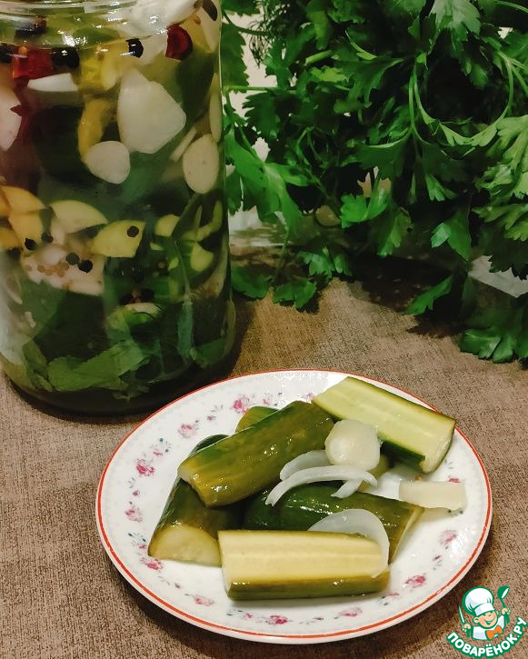 Необыкновенно вкусные огурчики получились! Как они нам понравились! Готовила из 1 кг огурцов, но я их нарезала. Остальное всё по рецепту. И лучок вкусный. Хрустящие, ароматные, всё в меру! Из зелени укроп, петрушка и мята свежие.