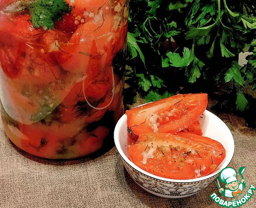 Очень и очень вкусные помидорки получились! Всё по рецепту, но из 1 кг помидор. Сорт сливка – крупные и твердые. А какие ароматные, чесночные! Очень понравились! Можно круглый год делать, в т.ч. из зимних стеклянных помидорчиков.