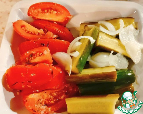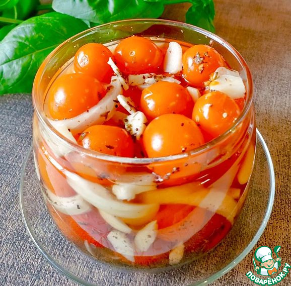 Замечательные помидорки! У меня черри оранжевые. Необыкновенно вкусные получились. До салата не дожили, т.к. съели сразу маринованные. И лук очень вкусный!