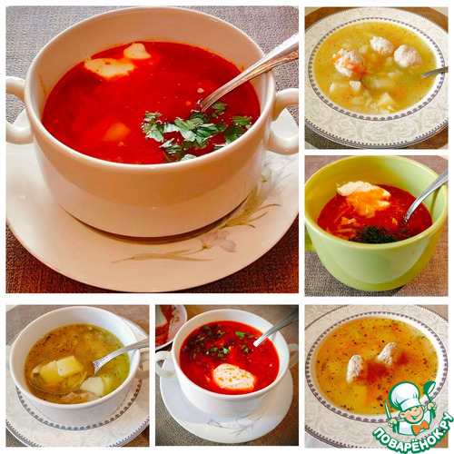 Все борщи такого красивого цвета! У меня, хоть и придерживаюсь рецептов, почему-то бывает по-всякому Суп с фрикадельками готовили в школе на уроках домоводства. Потом дома я первый раз в жизни сама повторила это блюдо и с тех пор очень его люблю. Людочка, красивые фото, с удовольствием посмотрела всё меню.