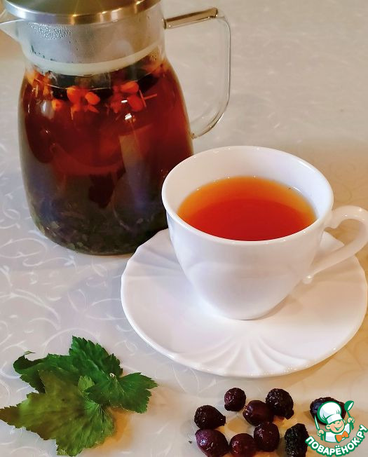 Вкусный чай! Очень понравился! Облепиха из заморозки, листья и шиповник сушеные. Добавила ещё горсточку черного чая.
