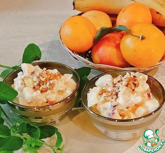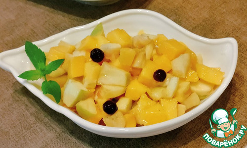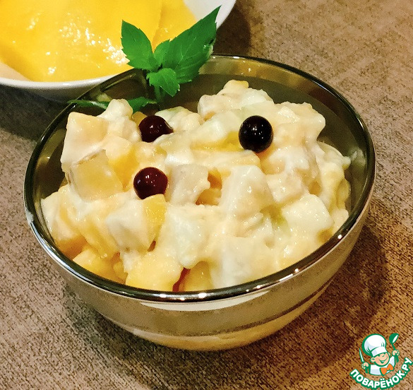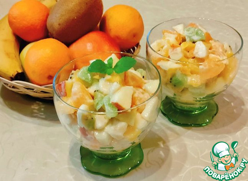 Очень вкусный, очень ароматный фруктовый салат-десерт! Заправляла натуральным йогуртом. Очень понравился!