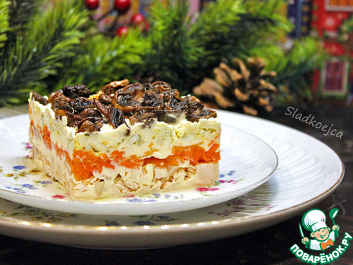 Симпатичный и вкусный салат, нам понравился. В составе есть курица и грибы.