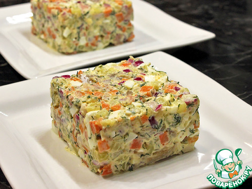 В салате нет картофеля, зато есть свежая (сырая) морковь. Хорошо знакомый салат зазвучал по-новому. Было вкусно, нам понравился этот вариант.
