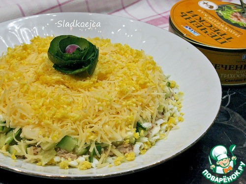 Отличный салат! С печенью трески трудно придумать какие-то новые сочетания, обычно - яйцо, лук, огурец, картофель… Здесь - все то же (без картофеля), но есть еще тертый сыр. Как по мне, он украсил салат. Я еще для остроты слои слегка посыпала молотым перцем.