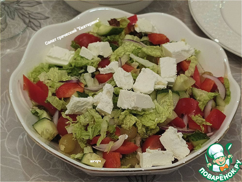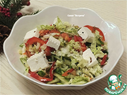 После сытных мясных салатов захотелось что-то легкое овощное. Вместо листьев салата использовала пекинскую капусту (зеленую часть). Сыр греческий. И от себя добавила смесь семян для салата и чуть бальзамика. Получилось вкусно.