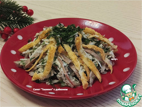 В наличии был свиной язык, с ним и приготовила. Вместо зеленого лука использовала укроп. Получилось вкусно, но мне не хватило во вкусе какой-то изюминки что ли.