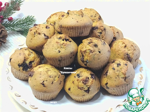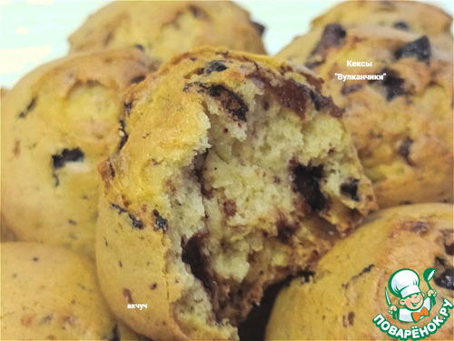 Готовила точно по рецепту. От себя добавила мелко порезанный шоколад. Выпекала 20 минут при 190 градусах. Получились очень вкусные кексики. И правда, как вулканчики.