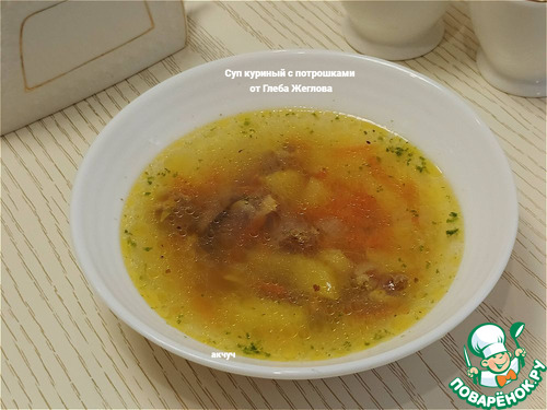 Ну уж если суп с потрошками, то и бульон я использовала от варки сердечек. Готовила в мультиварке сначала в режиме «Жарка», а потом использовала режим «Суп». Получился ооочень вкусный наваристый суп. С удовольствием пообедали!