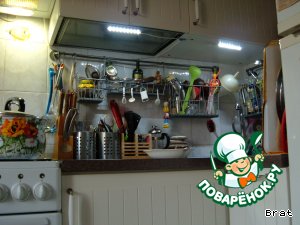 На радиорынке увидел в продаже полосу светодиодов довольно яркого света, купил и сделал вот такую штуку. Пусть не очень эстетично - провода видно, зато просто, дешево, практично. Светильники закрыты в термоусаживаемом пластике, так что влаги не боятся, их можно протирать и мыть. При необходимости легко снять. Питание 12 вольт - абсолютно безопасно даже без изоляции. Фото сделал без вспышки - свет от подсветки, немного от вытяжки и окна, светят очень ярко.