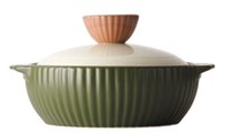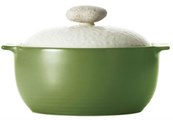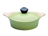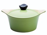 Кастрюля 20 cм, 2 ручки, с крышкой. Оливково-зеленого цвета. Светлое (кремовое) внутреннее покрытие. Толщина дна - 4,1 мм, объем - 2,4 л. В комплекте 2 прихватки.