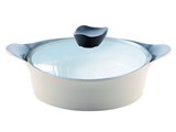 Голубое внешнее и белое внутреннее керамическое покрытие. Диаметр: 18 см, размер: 36 х 20,5 х12 см