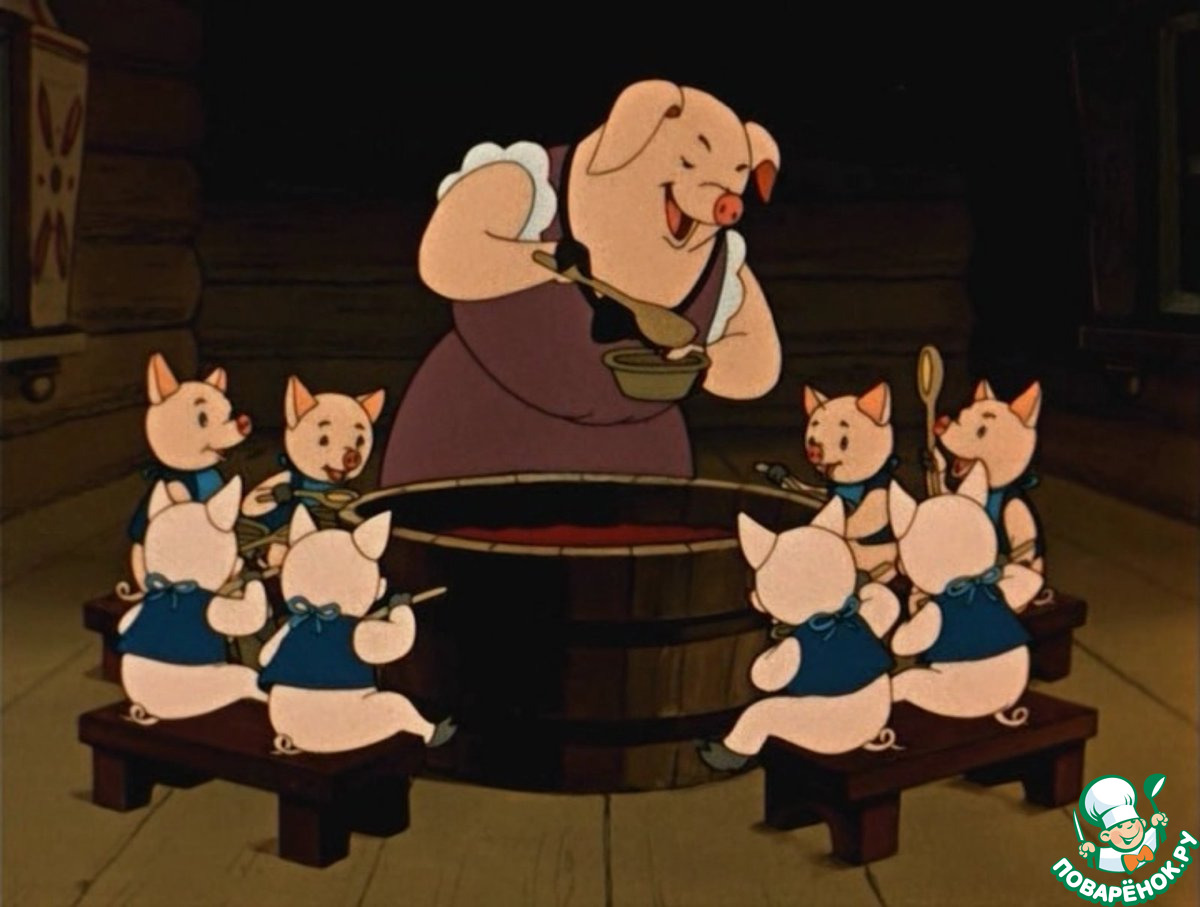М/ф: "Кошкин дом". " - Ты свинья и я свинья, все мы братья свиньи. Нынче дали нам друзья целый чан ботвиньи." Ботвинья