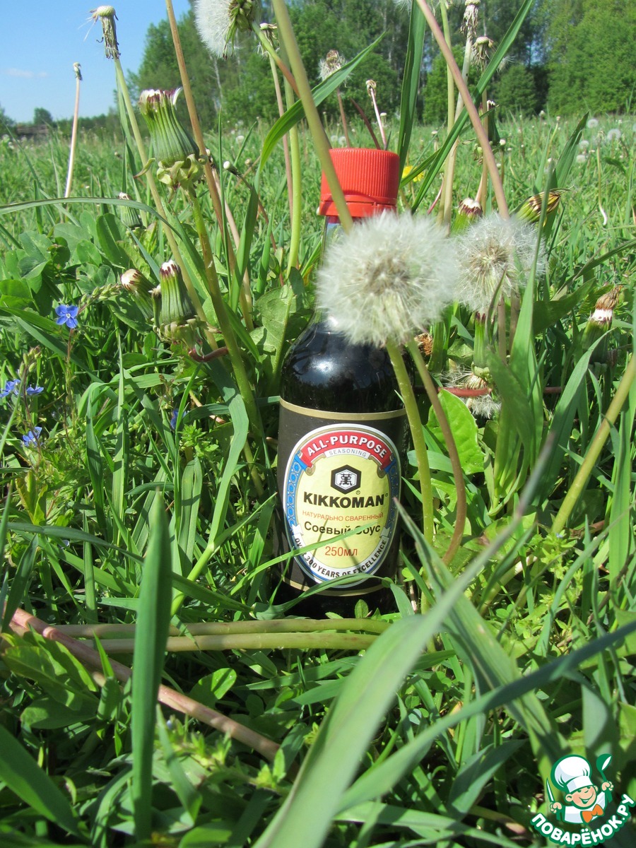 Зеленая трава, одуванчики, где-то виднеются цветочки...пахнет свежестью травы и среди всего этого весеннего богатства красуется соус Kikkoman!