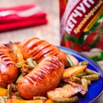 Колбаски с картофелем и фасолью Если добавить к привычному блюду кенийскую фасоль и специи для чахохбили, тушеные в этом необычном соусе с кетчупом «Махеевъ» Краснодарский, сардельки и картофель превратятся в настоящий праздничный ужин!
