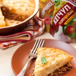 Пастуший пирог Сытная картофельная запеканка с мясом. Используемые продукты – горчица столовая и кетчуп Татарский «Махеевъ».