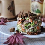 Все ингредиенты постоянно в продаже, ничего «добывать» в супермаркетах не нужно. Поэтому салат готовлю как на праздник (да простят меня анти-маЯнезники!), так и просто по охотке. Но для конкурса решила придать внешнему виду немного лоска, с претензией на ресторанную подачу)))