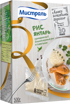 пропаренный длиннозерный рис Янтарь при приготовлении всегда получается рассыпчатым, а янтарные зерна становятся белоснежными.