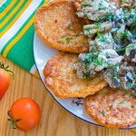 Предлагаю приготовить оладьи из пшенных хлопьев, сладкого перца и лука. Рецепт найден мной на немецком кулинарном сайте (приготовлены оладьи с небольшими изменениями). Подаются они с творогом, смешанным со сметаной.