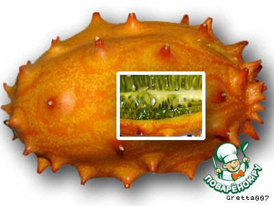Плоды кивано желтого цвета, по форме слегка напоминают дыню. Поверхность фрукта усеяна наростами правильной конической формы, напоминающими шипы, но не острыми. Мякоть его по консистенции желеобразная, окрашена в глубокий зеленый цвет и усыпана множеством съедобных семечек.