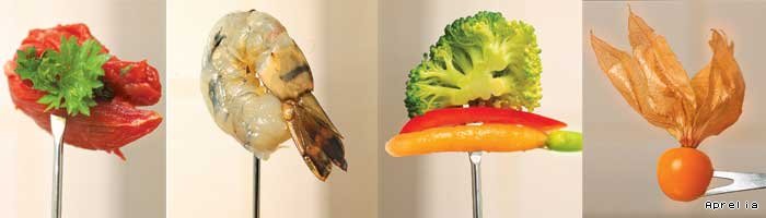 На порционные тарелки гостям раскладывают по 175–225 г нежирного филе говядины, то есть примерно два антрекота, разрезанные на кубики размером 2 см. Соусы и приправы ставят либо в порционных мисочках, либо в одной большой миске. Масло нагревают на плите, а затем переносят фондюшницу на стол и ставят ее над спиртовкой. Вилочки быстро накаляются, поэтому поджаренное в масле мясо следует с них снять, чтобы не обжечься.