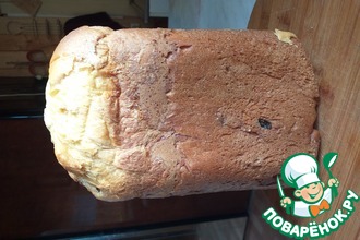 Хлеб очень понравился, из сухофруктов был изюм и сушёные ананасы. Сфотографировать полностью не успела, сразу половину съели. Единственный минус - для моей хлебопечки общее количество ингредиентов оказалось критическим, хлеб вылез...