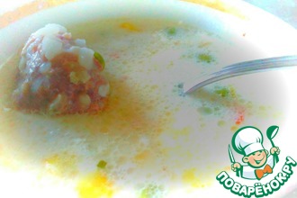 Мария, а вот и наш сырный супец!)) Овощной зажарки не делала (чтоб и малышу покушать было можно), а для обогащения вкуса ещё добавила немного зелёного горошка и риса. Мы очень вкусно отобедали! Спасибо!!! (Даже муж съел половничек...