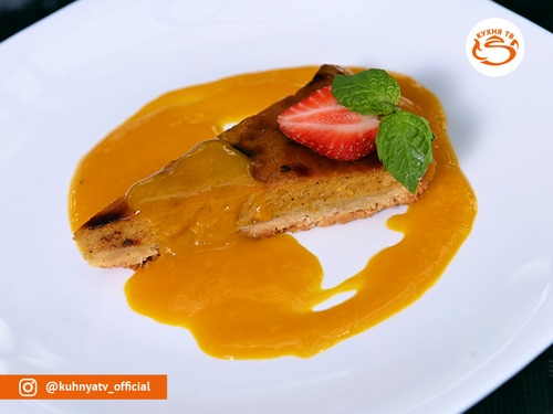 Шаг 5. Аккуратно высыпьте чечевицу из формы. Залейте пирог начинкой так, чтобы она была чуть ниже краев. Верните пирог в духовку при температуре 190 градусов на 30 минут. При подаче полейте кусочки пирога манговым соусом — для этого пробейте погружным блендером манговое пюре.