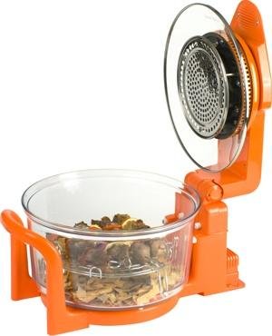 Для начала обратите внимание на технические характеристики. В аэрогриле, в отличие от обычной духовки, где конвекция хаотична, потоки горячего воздуха распределяются правильно. Происходит это благодаря особой форме колбы и специальной ячеистой решетке, закрывающей тэн. Такая конструкция обеспечивает «правильную» циркуляцию воздуха: от стенок к центру. Если же такой решетки нет, или она чисто символическая (в виде сеточки), продукты никак не защищены от жара, исходящего от тэна. В результате еда либо обгорает снаружи, либо не прожаривается. К тому же продукты получатся более сухими, чем в оригинальной технике.