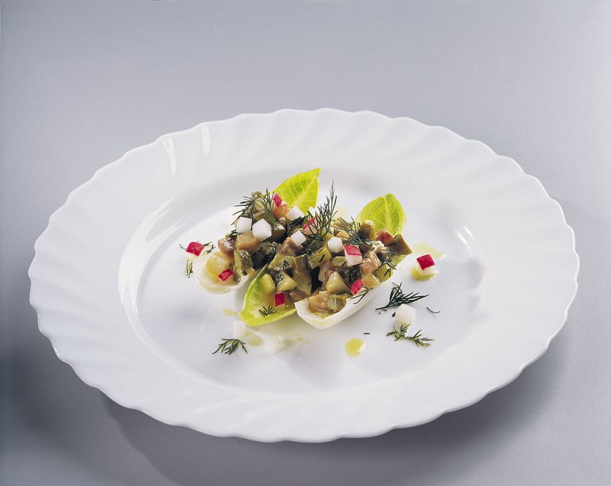 Норвежскую сельдь разделать на филе и нарезать кубиками. Также нарезать кубиками корнишоны и редис. Смешать горчицу, мед и уксус, при помешивании влить растительное масло до образования однородной массы. Смешать кубики сельди и корнишоны, заправить горчичным соусом. Салат выложить в листья эндивия, посыпать кубиками редиса и укропом.