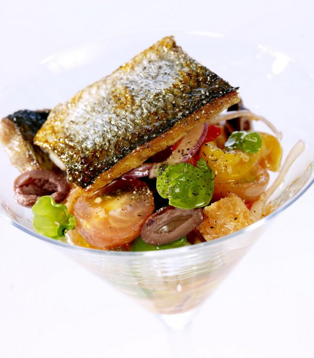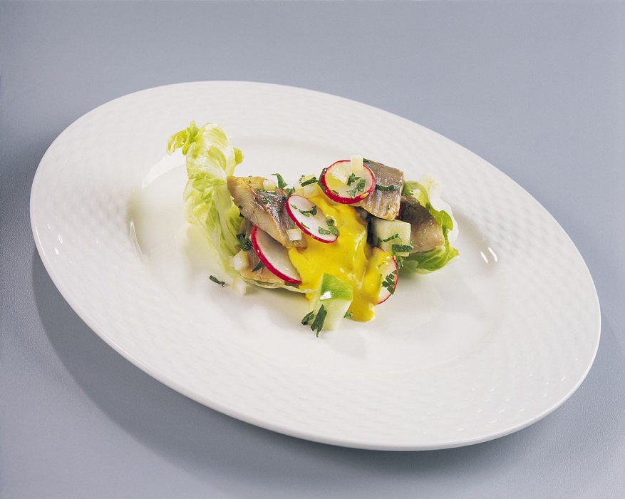 Промытое и вымоченное филе норвежской сельди нарезать на маленькие кусочки. Нарезать молодой лук, редис и маринованное ассорти (например, грибы, огурцы) небольшими полосками, добавить нарубленную мякоть помидоров. Все ингредиенты смешать с рыбой, приправить дижонской горчицей, лимонным соком, свеженарезанным укропом, посолить и поперчить. Рекомендуем подавать салат с отварным или обжаренным молодым картофелем и свеженатертым сыром Oscypek.
