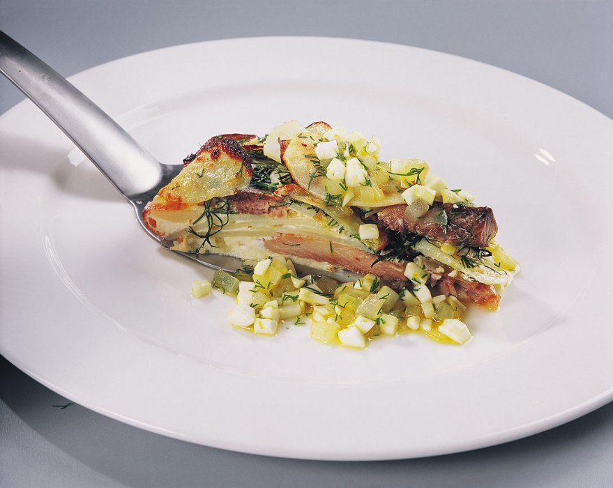 Филе норвежской слабосоленой сельди вымочить в смеси молока и воды в течение 10 – 12 часов и нарезать крупными ломтиками. Картофель очистить и нарезать тонкими кружками. Лук мелко нарезать и обжарить на растительном масле. Форму для запекания смазать маслом, выложить слоями картофель и селедку, смазывая каждый слой взбитым яйцом, а сверху посыпать мелко нарезанным луком и укропом. Последний картофельный слой густо смазать яйцом, залить сметаной и запекать в духовке в течение 25 – 30 минут. Тем временем приготовить соус: отварить яйца вкрутую, крупно их нарезать. Очистить и нарезать кубиками лук, слегка подогреть его в растопленном сливочном масле с добавлением лимонного сока, затем смешать с нарезанными яйцами и укропом. Перед подачей к столу полить запеченную сельдь соусом.