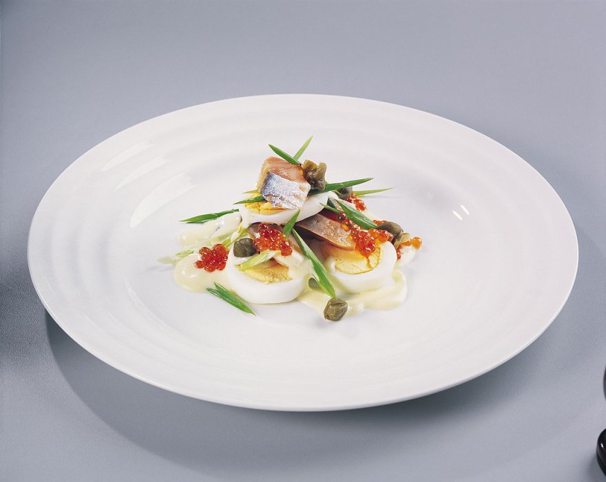 Норвежскую сельдь разделать на филе и нарезать ломтиками. Яйца сварить вкрутую, остудить и нарезать кружками. Сельдь и яйца уложить слоями в виде горки, пересыпая каперсами и нарезанным зеленым луком. Для приготовления соуса смешать охлажденное картофельное пюре, майонез и лимонный сок. Перед подачей к столу полить блюдо соусом и украсить красной икрой.