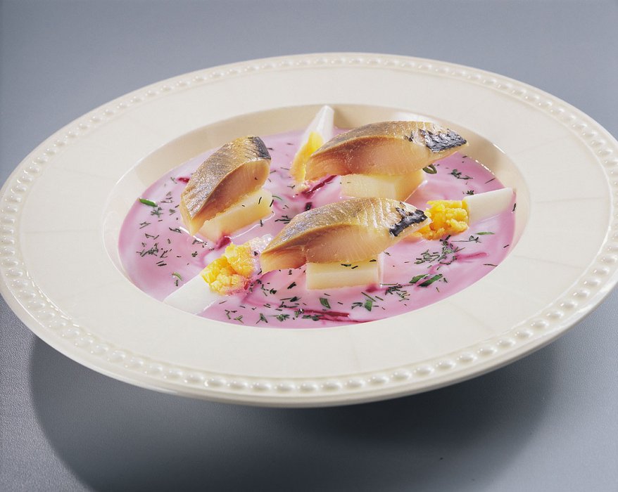 Картофель нарезать квадратами, со сторонами примерно по 4 см, отварить и остудить. Норвежскую сельдь разделать на филе и нарезать ломтиками. Кефир взбить, добавить бульон, нарезанную соломкой отварную свеклу, часть шинкованного зеленого лука и укропа. При подаче к столу в тарелки положить по три кубика картофеля и на каждый – по ломтику сельди. Залить жидкость так, чтобы сельдь была выше уровня супа. В тарелки положить дольки вареного яйца. Посыпать мелко нарезанным зеленым луком и укропом.