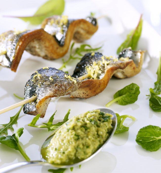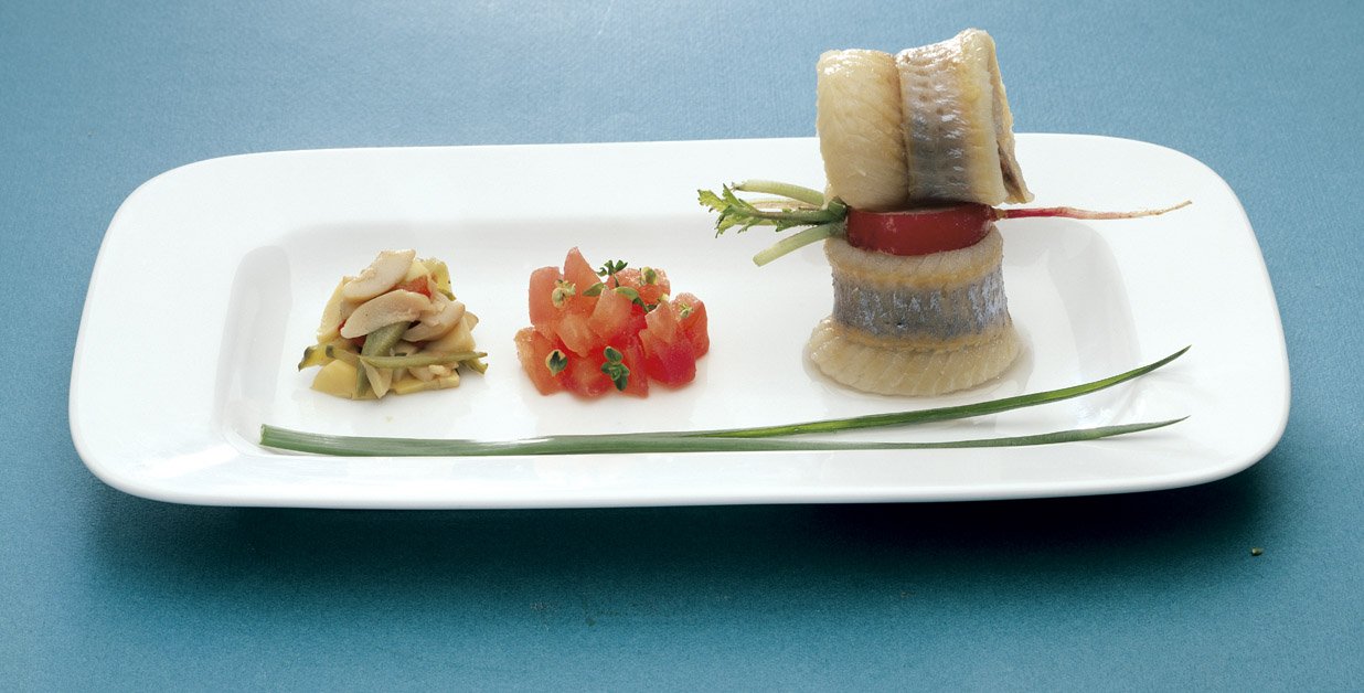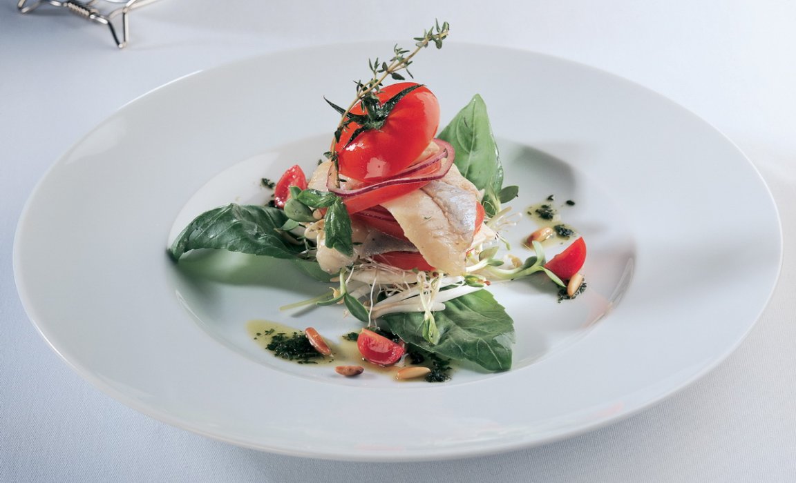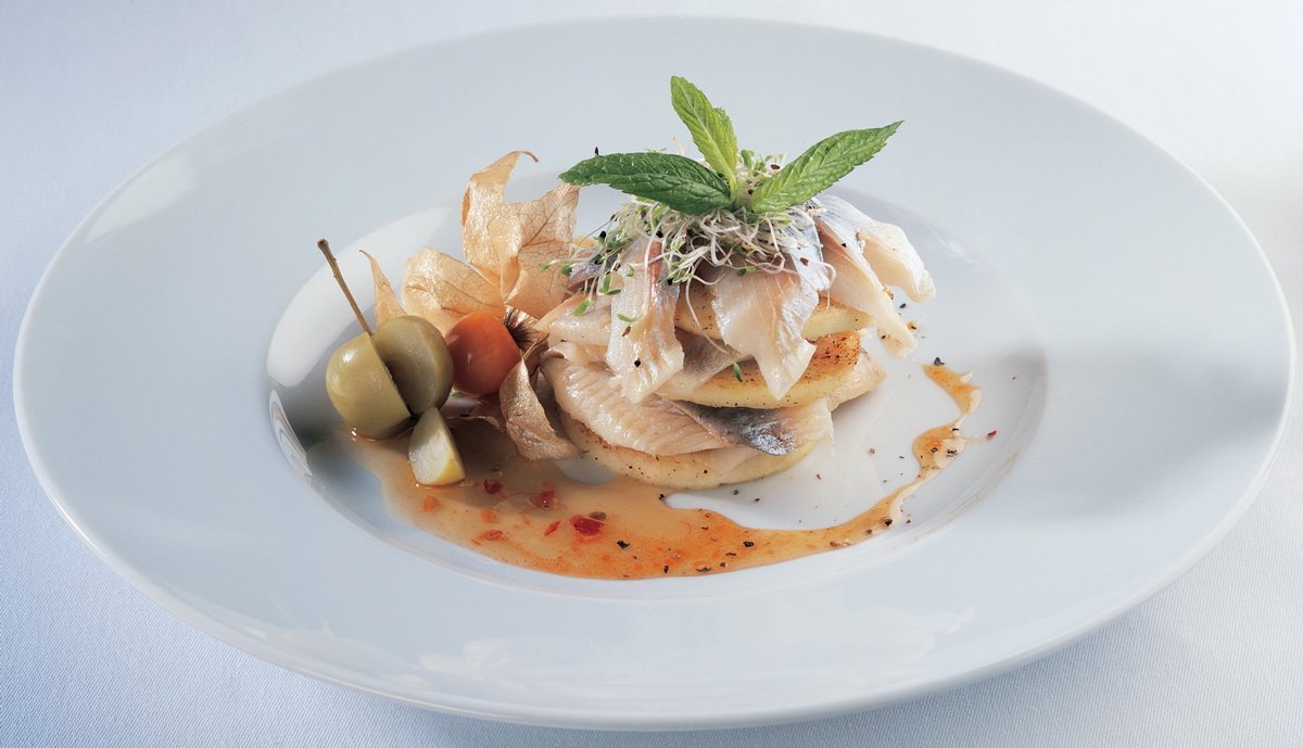 Филе норвежской сельди выдержать в маринаде двенадцать часов. Картофель отварить в мундире, нарезать тонкими ломтиками и обжарить на гриле. Мякоть помидоров нарезать кубиками, полить оливковым маслом с чесноком и кориандром. Каперсы нарезать, смешать с остальными ингредиентами соуса. Кусочки филе уложить на теплый картофель. Украсить помидорами и разноцветным салатом-латуком. Залить блюдо ароматным соусом.